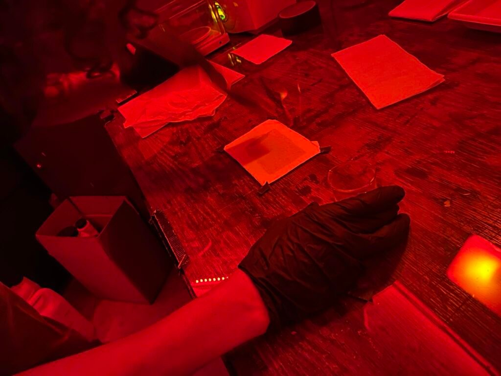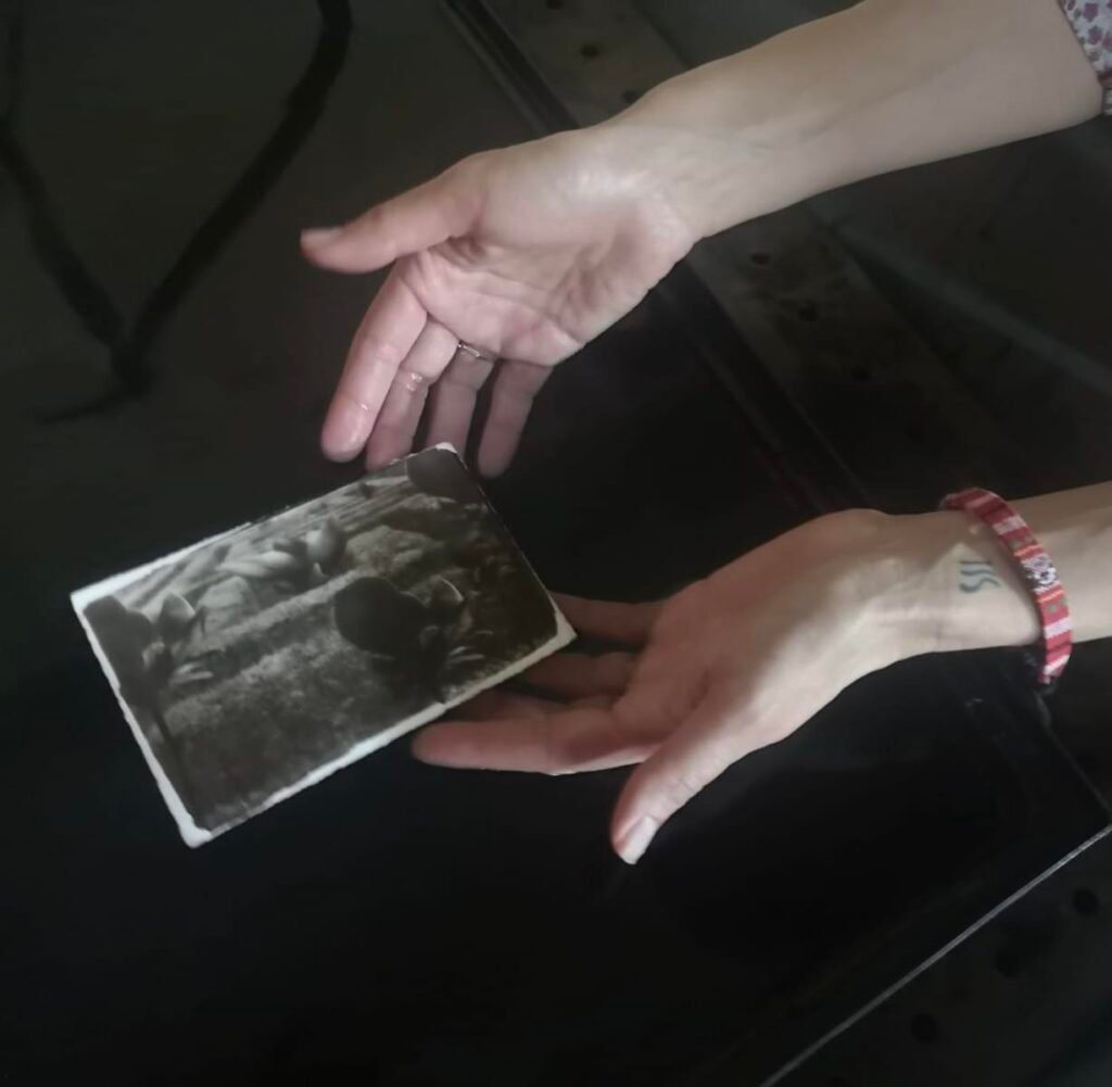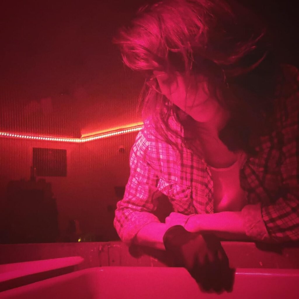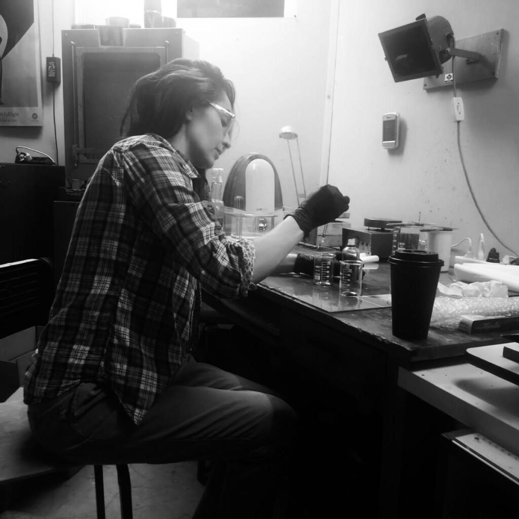 Rozwiń i Zobacz serię zdjęć zrobionych artystce w pracowni podczas wywoływania platynotypii